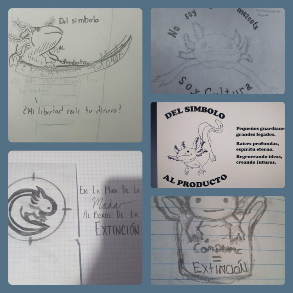 Todo diseño nace de una intención. Estos bocetos representan los primeros pasos para despojar al ajolote de su imagen “comercial” y devolverle su estatus de símbolo en peligro. A través de la experimentación con el dibujo a mano alzada, se exploraron conceptos como la “mirada de la moda” y la “reificación del ser vivo”, permitiendo que los errores del trazo manual guiaran la evolución hacia una identidad visual con impacto social y conciencia ecológica.