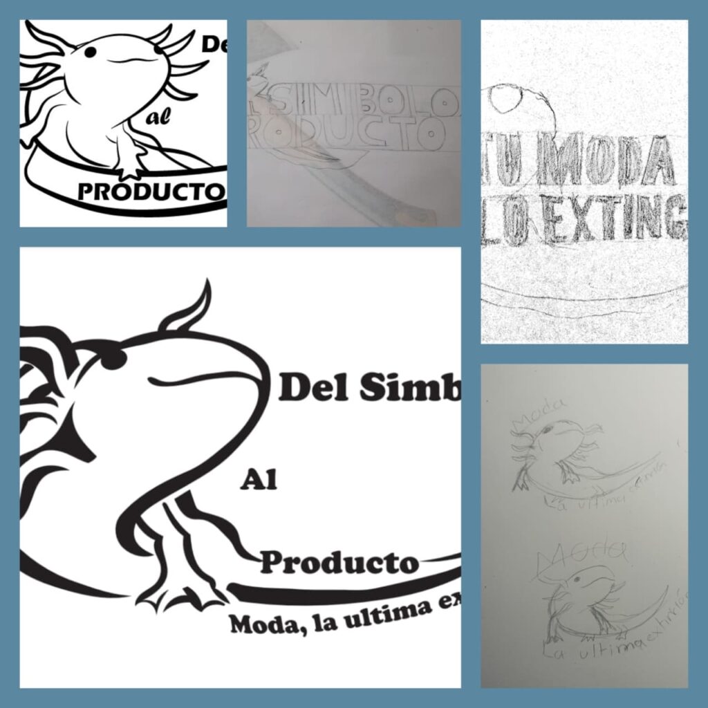 Esta etapa representa la búsqueda del equilibrio perfecto entre ilustración y mensaje. Los bocetos laterales (derecha) muestran la exploración continua de la pose del ajolote y la integración de las palabras “Moda” y “Extinción”. El panel central derecho es un ejercicio de impacto visual con tipografía pesada. Finalmente, el logo digitalizado de la izquierda muestra la decisión de colocar al ajolote como figura central, con el texto envolviéndolo en una estructura que sugiere protección pero también confinamiento, reflejando la complejidad de la problemática abordada.
