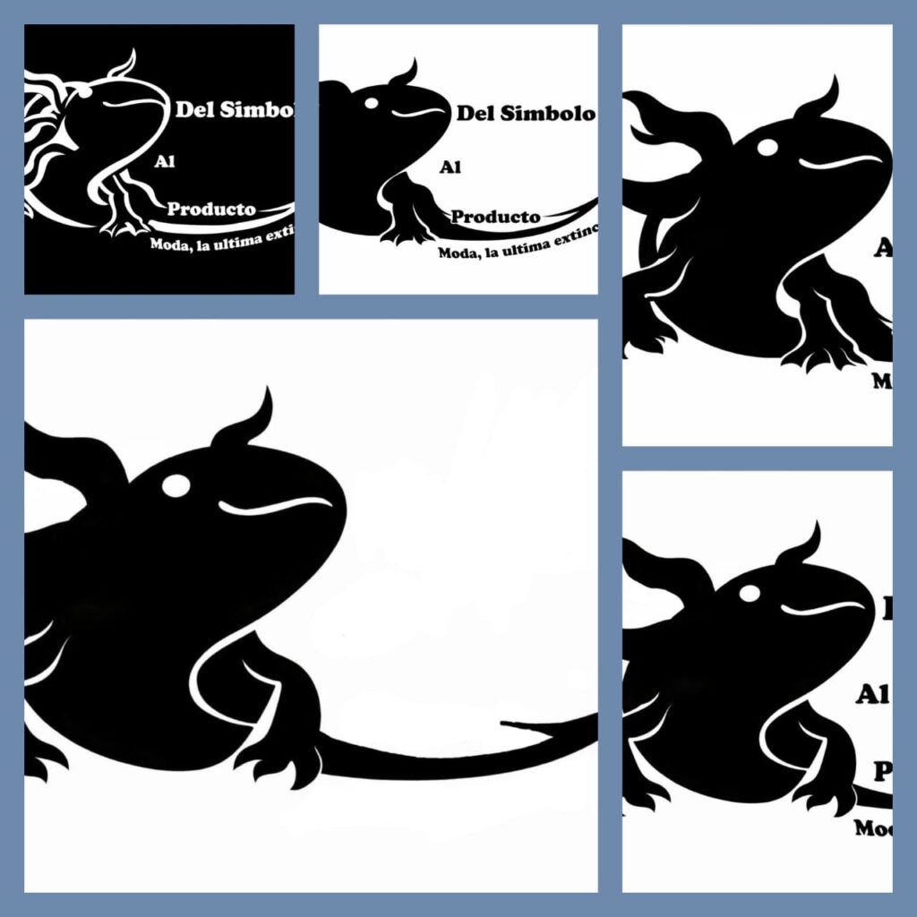 Esta fase representa la síntesis conceptual máxima. Se ha transformado la figura del ajolote, pasando de una ilustración de contorno (como se veía en el collage anterior) a una forma sólida y abstracta. Este cambio simboliza la pérdida de identidad del ser vivo cuando se reduce a un simple “producto” comercial. Las formas negras, casi como una silueta de impacto (imagen inferior izquierda), buscan una conexión visual directa y visceral, convirtiendo al animal en una figura de poder que interroga al observador, desprovista de detalles “tiernos” para enfatizar la seriedad de su situación.
