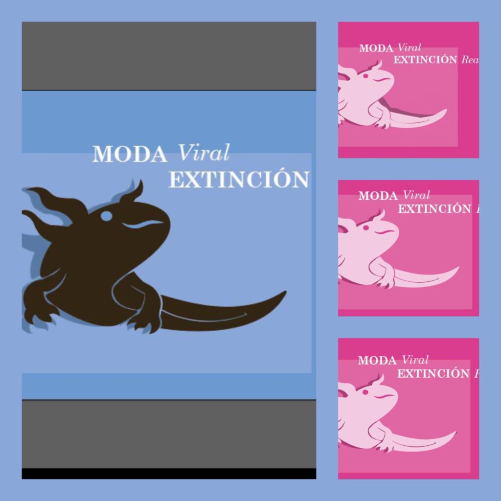 En esta fase, el símbolo y el discurso se unifican bajo una paleta de colores definida. El panel principal (izquierdo) establece la identidad “madre” para la marca crítica. Se ha definido el uso de colores específicos para diferentes “mensajes” o líneas de aplicación: un azul serio para la advertencia ecológica y un rosa “comercial” para parodiar o criticar la estética de la moda rápida. Los paneles derechos muestran cómo el icono del ajolote pastel se integra con los lemas recortados (“MODA Viral”, “EXTINCIÓN Real”), prefigurando su uso real en etiquetas de ropa, parches o material promocional donde el mensaje de impacto debe convivir con una estética atractiva. Es la etapa donde el logo sale del laboratorio de diseño para enfrentarse al contexto real de aplicación.