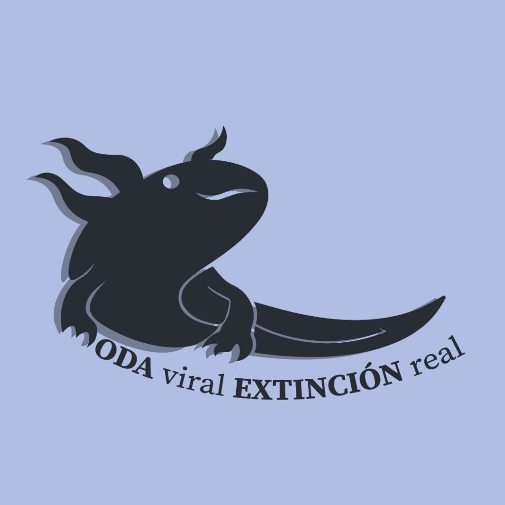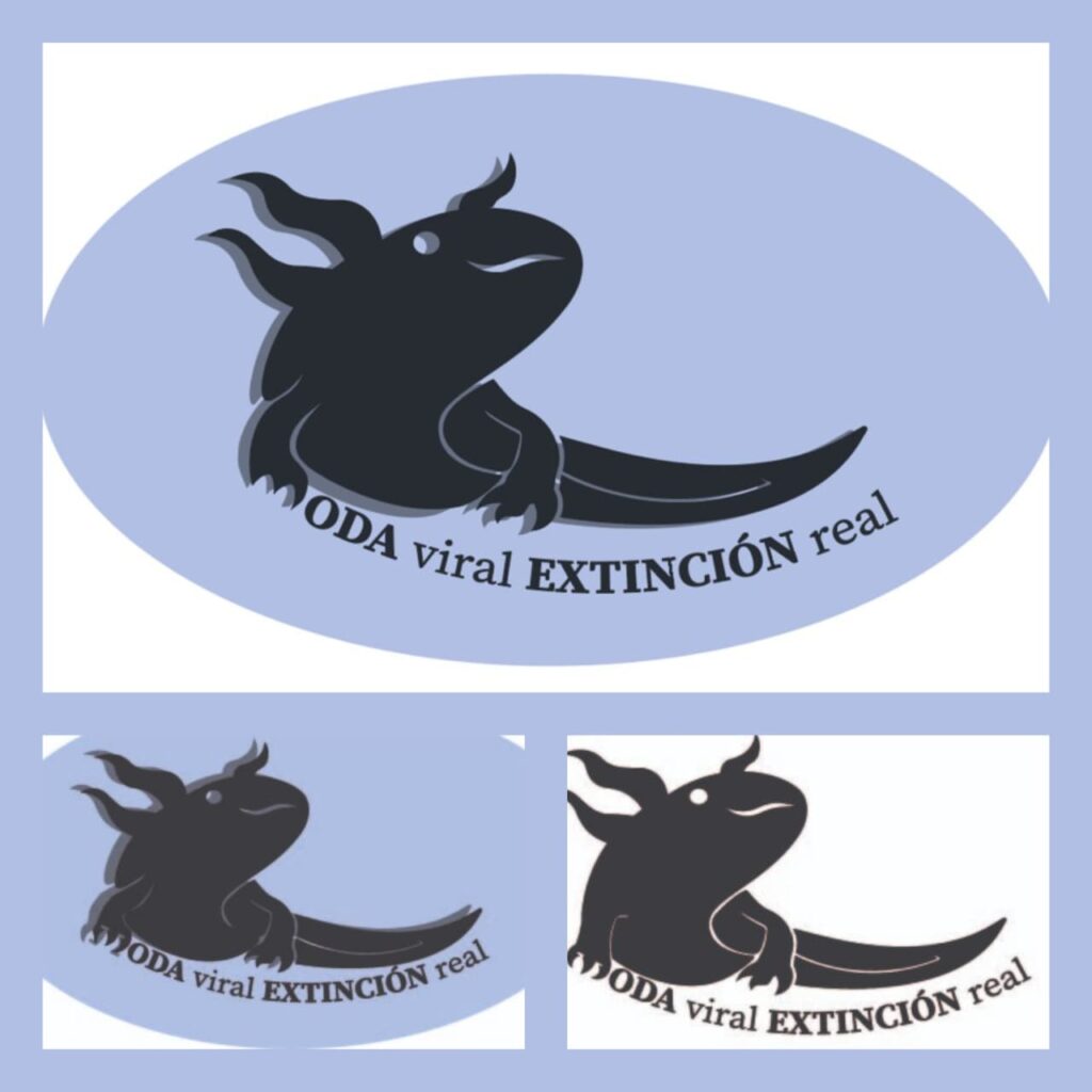 El logo final es una simbiosis de elementos gráficos y textuales. La forma elíptica actúa como un “portal” o escaparate de producto. La tipografía, que pasó de ser garabatos manuscritos a una serif robusta, se fija como “MODA viral EXTINCIÓN real”, utilizando jerarquías visuales, para reflejar la dicotomía de la problemática. El color azul frío y la paleta monocromática del ajolote, representan la verdad desnuda de la situación, despojándola de la seducción inicial del rosa comercial (visto en la etapa 4). Este emblema es la representación definitiva de cómo la moda, al volverse “viral”, tiene una consecuencia “real” e irreversible. Es la marca que no solo identifica, sino que interroga.